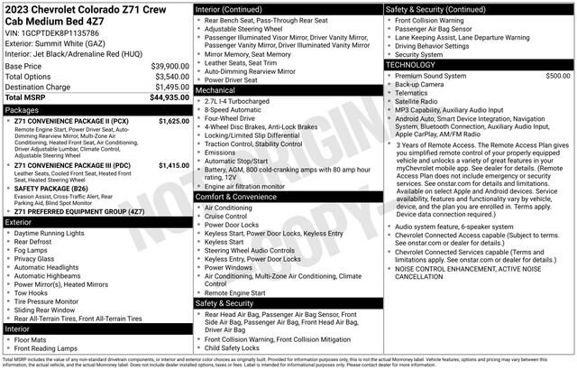 Elevate your driving experience with this stunning 2023 Chevrolet Colorado Z71. Boasting a powerful 2.7L Turbo engine paired with an 8-speed automatic transmission and 4-wheel drive, this Colorado delivers exceptional performance and capability. Wrapped in a sleek white exterior, this rugged yet refined truck is ready to tackle any adventure.- Z71 Convenience Package II- Z71 Convenience Package III- Bose Premium 7-Speaker Audio SystemThis Colorado Z71 is equipped with a host of premium features that will elevate your daily commute and weekend getaways. Enjoy the convenience of dual-zone automatic climate control, a tilt and telescopic steering column, and an EZ lift and lower tailgate. Stay connected with wireless charging and the advanced 11.3 diagonal color LCD display.For added comfort and luxury, this Colorado is equipped with perforated leather-appointed seating, ventilated front seats, and a heated steering wheel. The driver's seat offers 8-way power adjustability, lumbar support, and memory settings, ensuring a personalized driving experience every time.Safety is a top priority, and this Colorado comes equipped with Chevy Safety Assist features like Forward Collision Alert, Automatic Emergency Braking, and Lane Keep Assist with Lane Departure Warning. You'll also enjoy the added security of a Rear Park Assist system and Rear Cross Traffic Braking.Whether you're tackling rugged terrain or navigating the city, this 2023 Chevrolet Colorado Z71 is the perfect companion. With its impressive capabilities, premium amenities, and advanced safety technologies, this truck is ready to elevate your driving experience.Fox Chevrolet has been delivering on a promise since 1967. Come in and check out what the Fox Advantage truly is.