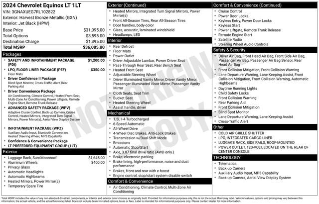 Boasting a 1.5L DOHC engine paired with a 6-Speed Automatic Electronic transmission and All-Wheel Drive, the Equinox LT delivers a smooth and efficient ride, with an impressive 24 city and 30 highway MPG. Indulge in the convenience of the power sunroof, the safety of the Advanced Safety Package, and the cutting-edge infotainment features of the Infotainment Package, including the Chevrolet Infotainment 3 Plus System, HD Surround Vision, and adaptive cruise control.