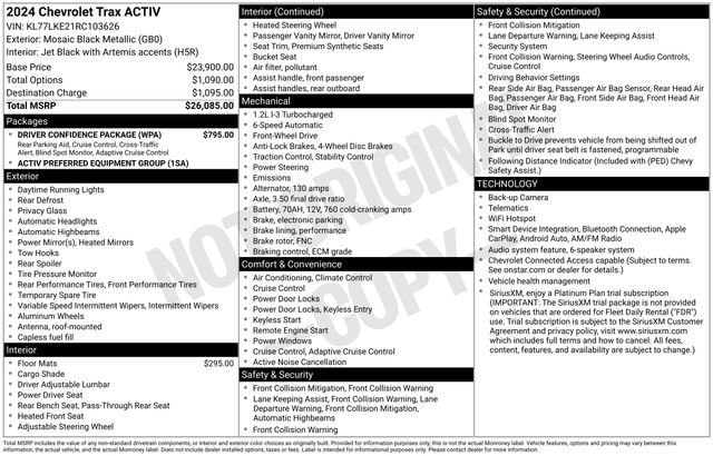 Introducing the 2024 Chevrolet Trax ACTIV, a compact crossover that seamlessly blends bold design, advanced technology, and exceptional performance. This dynamic vehicle is the perfect companion for your active lifestyle, offering a captivating blend of functionality and sophistication.